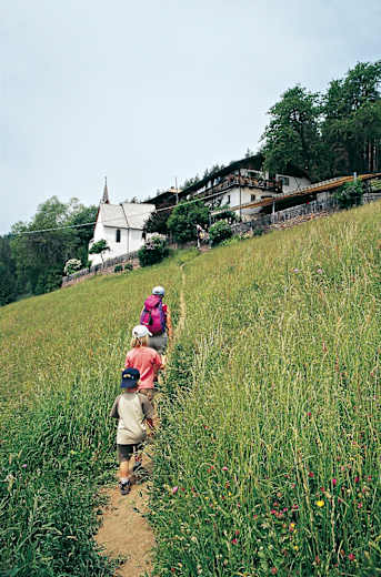Auf dem Fahrweg oberhalb des Gasthofs setzen wir die Wanderung Richtung Osten, also auf die Dolomiten zu, fort. Dieser Weg Nr. 8 wendet sich vor einer Häusergruppe nach links, und folgt gleich darauf dem Rechtsbogen eines Sträßchens. Von dem löst sich der Wanderweg im Wald vorübergehend und noch mal knapp oberhalb vom nächsten Ziel: der Wallfahrtskirche Maria Saal (1.184 m). Unbedingt sollte man das aus dem 16. Jahrhundert stammende, 1719 vergrößerte Kirchlein anschauen! Ein Kuriosum stellt im Triumphbogen das Temperagemälde „Muttergottes unter dem Regenschirm“ (1924) dar, entsprechend den frommen Wünschen „Maria, unter deinen Schutz und Schirm ... “.