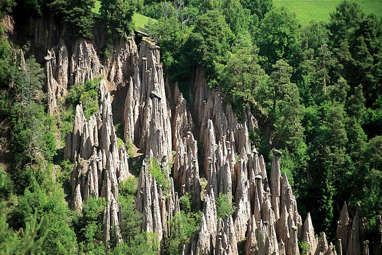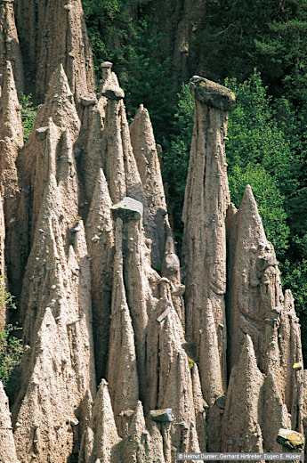 Die berühmten Erdpyramiden bestehen aus mächtigen Moränenablagerungen, die eiszeitliche Gletscher vor 20.000 Jahren im Graben des Finsterbachs abgelagert hatten. Foto: Helmut Dumler, Gerhard Hirtlreiter, Eugen E. Hüsler, Bergverlag Rother GmbH Bildergalerie (6)