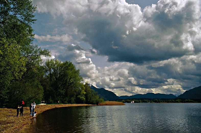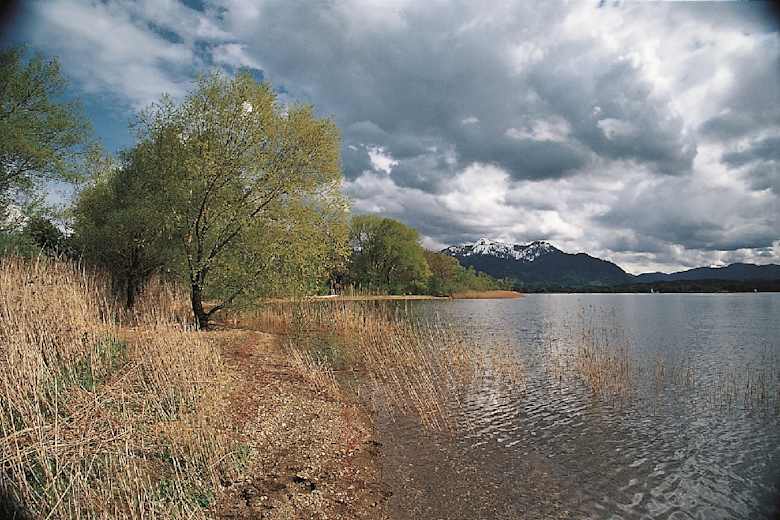 Das Ufer nahe Seewirts Strandhaus. Blick auf Hochplatte und Kampenwand (rechts). Foto: Gerhard Hirtlreiter, Rother Bergverlag