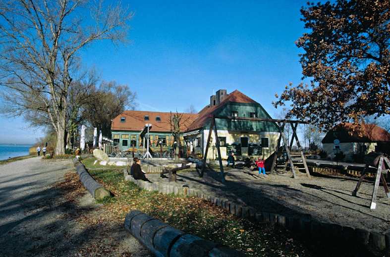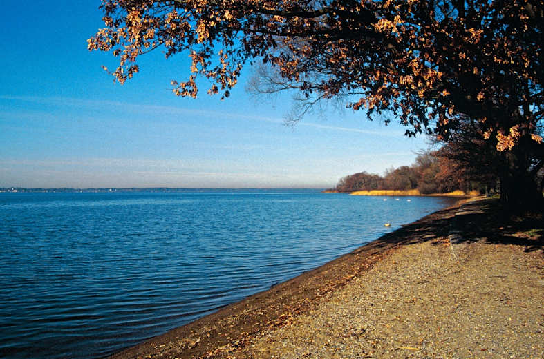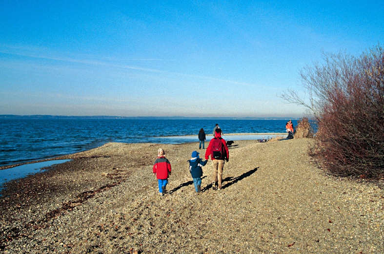 Dort sollte man sich Zeit nehmen, um die Infotafeln zu studieren und das Leben der Vögel zu beobachten. Blickt man nach Osten, sieht man das großteils bewaldete Achendelta – einige der wenigen Möglichkeiten es zu erleben; betreten darf man es nämlich wegen der geschützten Vogelwelt nicht. Wieder zurück auf dem Hauptweg, nehmen wir die ursprüngliche Gehrichtung wieder auf. Unser Weg wird bald schmäler und verläuft dann direkt am Ufer auf die Landzunge („Nikolauszug“) hinaus, die vom früheren Deltaarm in den See geschüttet wurde. Von einem kleinen Nehrungshaken leitet ein wunderschöner seenaher Spazierweg wieder auf die Alpenkulisse zu.