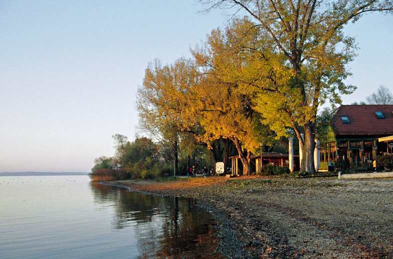 Abendstimmung am Chiemseeufer bei der Seewirtschaft. Foto: Gerhard Hirtlreiter, Rother Bergverlag