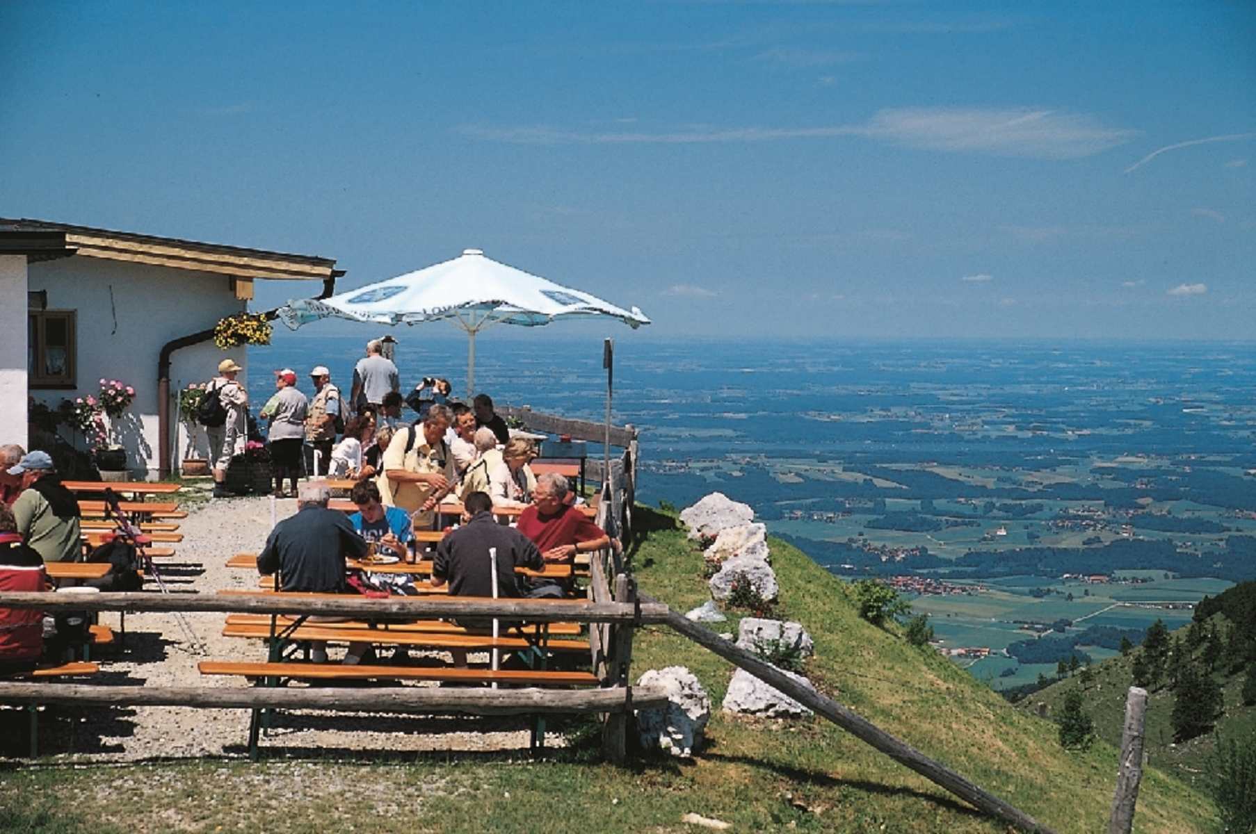 Von der Bergstation der Seilbahn folgen wir dem breiten Wanderweg, der an der Sonnenalm (1470 m) vorbeiführt. Nach einer kurzen Steigungsstrecke öffnet sich der überwältigende Blick aufs Alpenvorland und den Chiemsee – eine Aussicht, die auch die bequeme Querung hinüber zur Steinlingalm (1.450 m) begleitet. Wie bei Tour 49 „Kampenwand Nordanstieg“ erklimmen wir anschließend den kreuzgeschmückten Ostgipfel der Kampenwand (1.664 m).