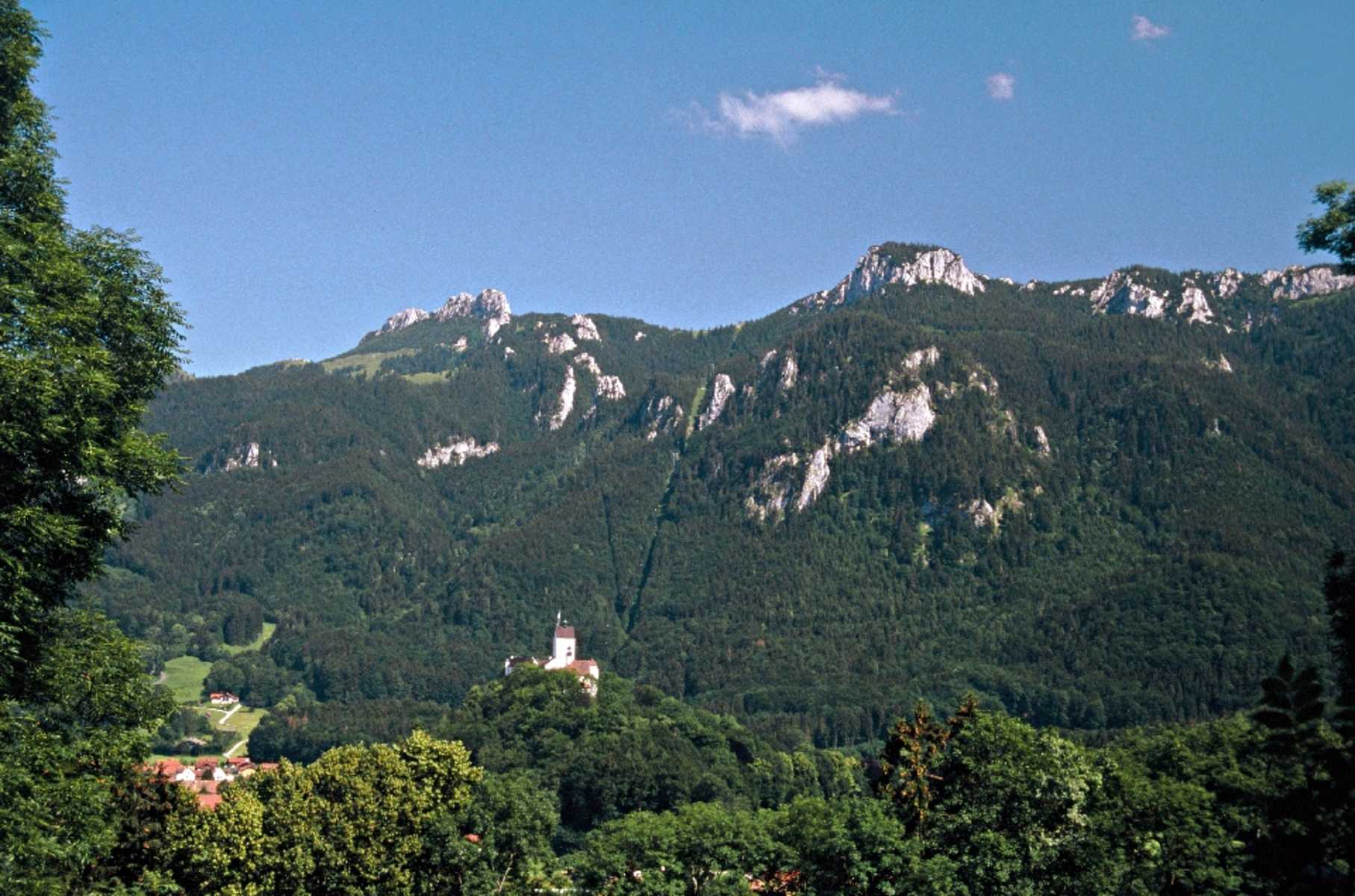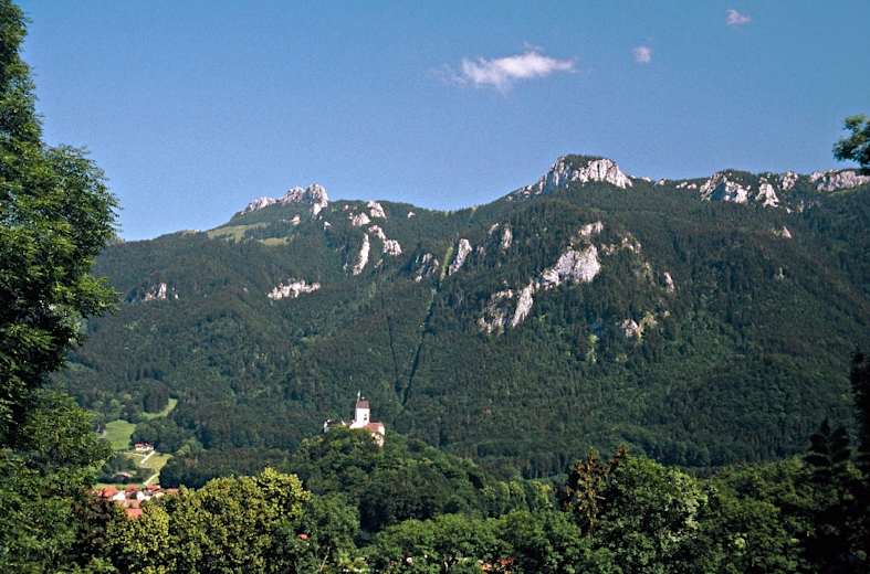 Blick über die Burg auf die Westseite der Kampenwand. In der schnurgeraden Trasse durch den Wald verläuft die Seilbahn. Foto: Gerhard Hirtlreiter, Rother Bergverlag