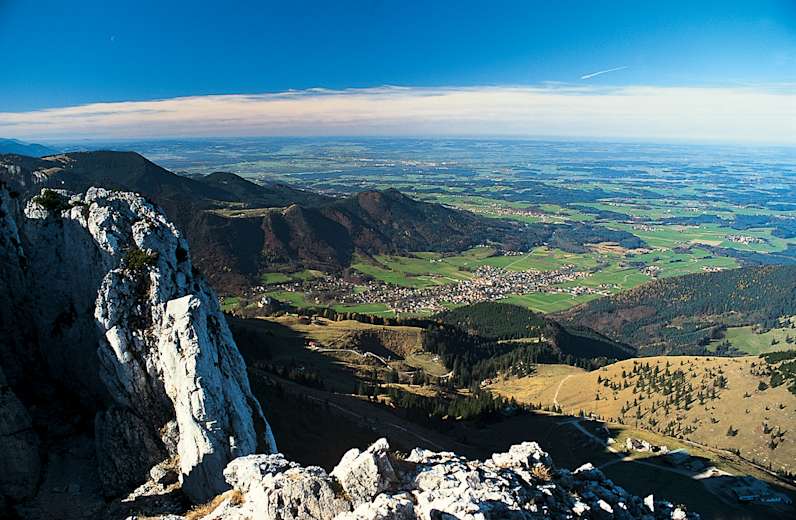 Blick vom Gipfel auf die dunklen Kaisersäle (links), Aschau und das Alpenvorland. Foto: Gerhard Hirtlreiter, Rother Bergverlag