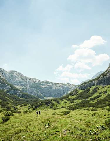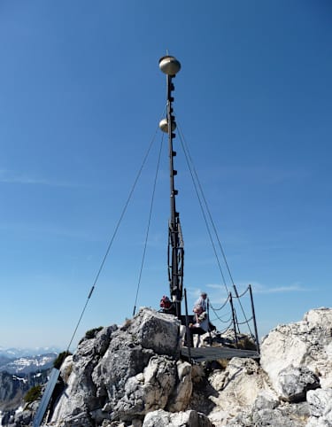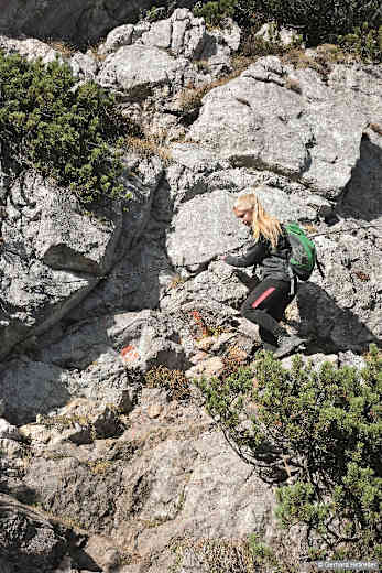 Beim Abstieg gehen wir die wenigen Anstiegsmeter zurück zur Querung an der Nordseite des Gipfelstocks; dort wenden wir uns dann nach rechts und passieren den Hinweis „nur für Geübte“. Unter einer Felskante folgt ein Wandstück, das wir spektakulär überwinden, indem wir uns an einem Stahlseil hinunterhangeln. An dessen Ende dann scharf nach rechts. Nach einer Geländeecke folgt noch eine weitere Passage am Stahlseil. Dann beschreibt der Steig einen Linksbogen. Einige Meter weiter geht es rechts über eine leicht zu übersehende Felsschwelle. Nun durch eine Latschengasse gerade hinab zu einer kleinen Wiese.