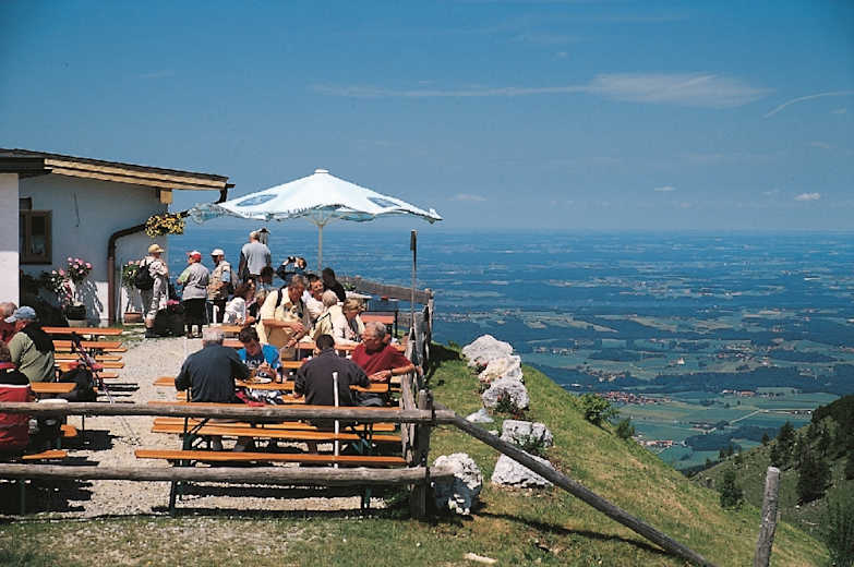 Dort ignorieren wir die Wegweiser nach links und folgen einem unauffälligen, nicht ausgeschildertem Pfad nach rechts. Dieser führt ohne große Höhenunterschiede unter den eindrucksvollen Südwänden der Kampenwand – ein Eldorado für gute Kletterer – nach Westen. Nach einem abschließenden Anstieg lockt schließlich die aussichtsreiche Terrasse der Sonnenalm (1.470 m).