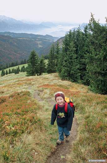 2) Beschilderter Abstecher von der Wagneralm durch steilen Bergwald (Schwierigkeit „rot“) und über aussichtsreichen Gipfelrücken aufs Feichteck (1.514 m), 1¼ Std. rauf, 1 Std. zurück zur Wagneralm.