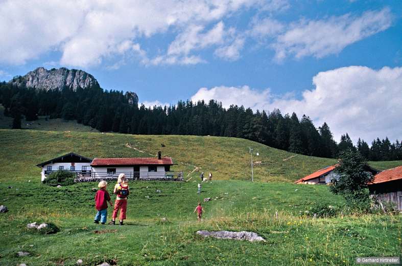 Vom Duftbräu (780 m) gehen wir entlang der Straße einige Meter hinab zum Fluderbach. Unmittelbar vor der Brücke setzt rechts unser Wanderweg an, der ausgesprochen reizvoll neben den Wasserfällen des Bachs bergan führt. Bei der ersten Wegkreuzung halten wir die Grundrichtung bei (über die Brücke links kommen wir am Ende der Tour von der Wagneralm zurück). Jetzt folgt eine flache Waldpassage neben dem hier lustig plätschernden Fluderbach. Auch bei der nächsten Verzweigung ignorieren wir die Brücke und ziehen über eine Lichtung hinan (am Bach darunter tolle Spielmöglichkeiten für Kinder). Im nächsten Waldstück geht es über ein Kiessträßchen geradewegs hinweg in eine kleine Senke. Im Wald darüber fordert eine kurze steinige Wegpassage etwas Trittsicherheit. Nach der Steilstufe halten wir uns bei einer unscheinbaren Verzweigung rechts. Nach einer wurzeligen Waldpassage sind die Almwiesen der Daffnerwaldalm (1.050 m) erreicht, wo mit der Deindlalm (rechts) und Laglerhütte (inks) gleich zwei Brotzeitstationen zur Einkehr locken.