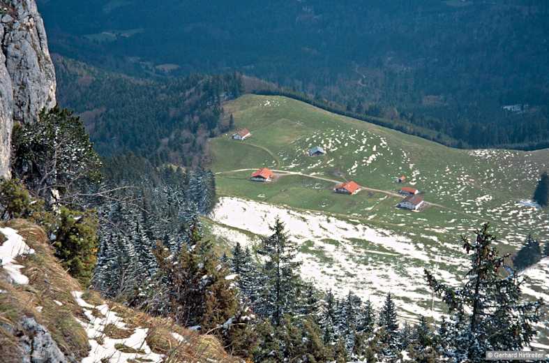 Blick vom Gipfelanstieg auf die Wasserwand hinab zur Daffnerwaldalm. Foto: Gerhard Hirtlreiter, Rother Bergverlag