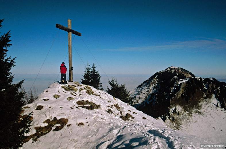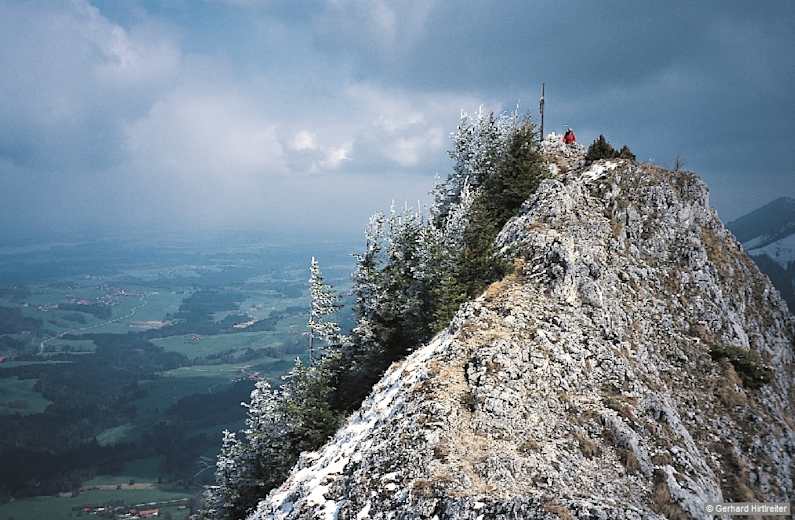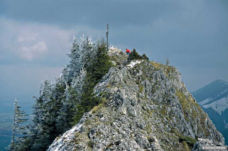 Über den Gipfelgrat nach rechts erreicht man das exponierte Gipfelkreuz der Wasserwand (1.367 m). Foto: Gerhard Hirtlreiter, Rother Bergverlag