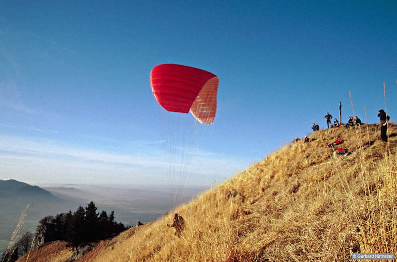 Start eines Gleitschirmfliegers am Westhang der Graskuppe. Foto: Gerhard Hirtlreiter, Rother Bergverlag