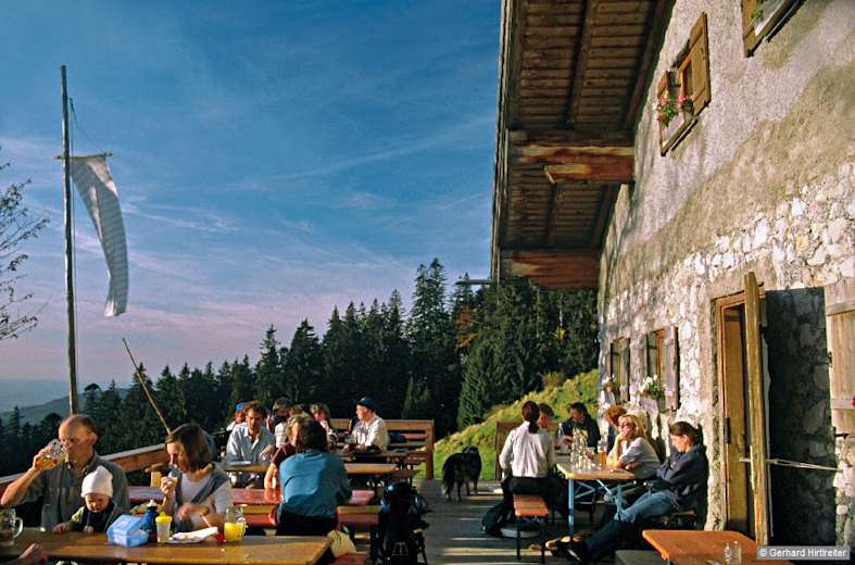 Nach einem kurzen Gefälle nehmen wir die nächste Abzweigung zur abschließenden Einkehr bei der gemütlichen Wagneralm (1.040 m): A fein's Platzerl an der Sonne ... Foto: Gerhard Hirtlreiter, Rother Bergverlag