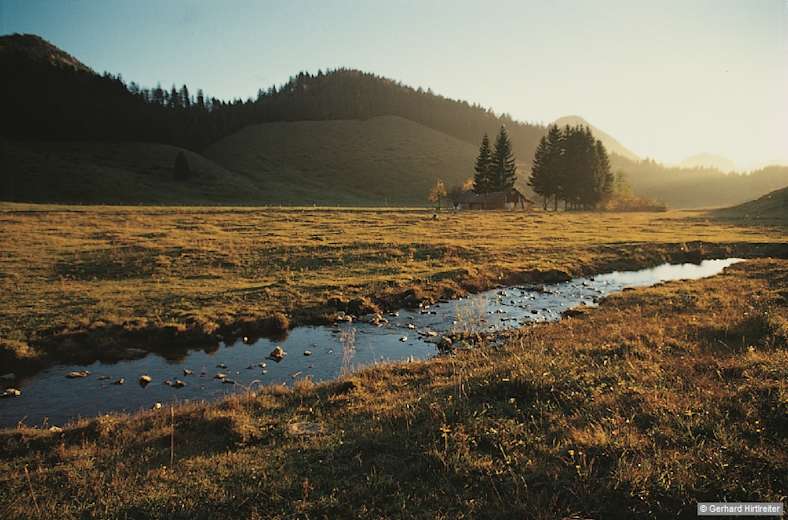 Hinter dem Euzenauer Bach die (unbewirtschaftete) Triesdorfer Hütte. Foto: Gerhard Hirtlreiter, Rother Bergverlag