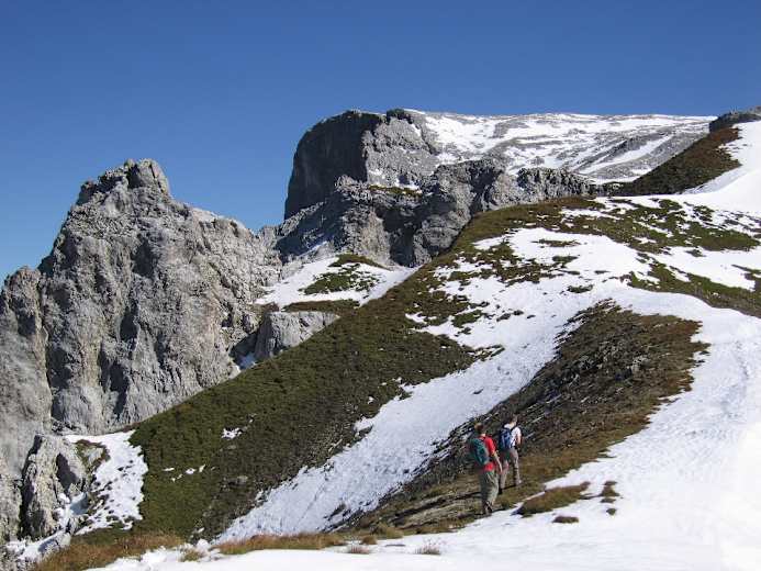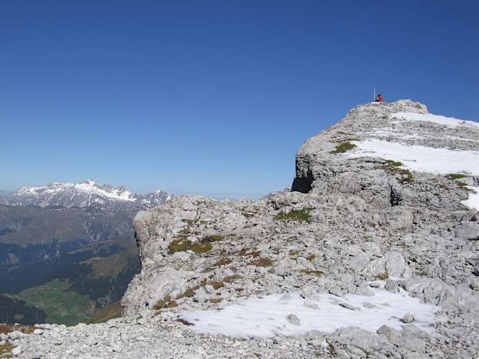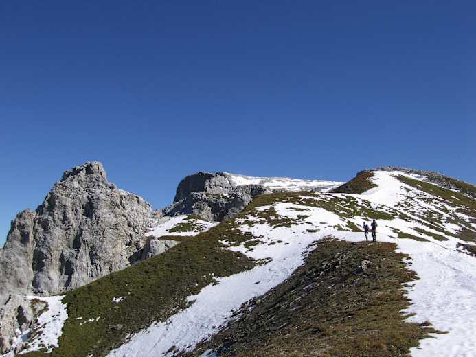 Das etwas höhere Rätschenhorn lässt sich leicht „mitnehmen“: erst abwärts, mit eindrucksvollem Blick auf die mächtigen Felsabstürze der Rätschenflue, dann nach kurzem Aufstieg zum Gipfel, 2.703 m.