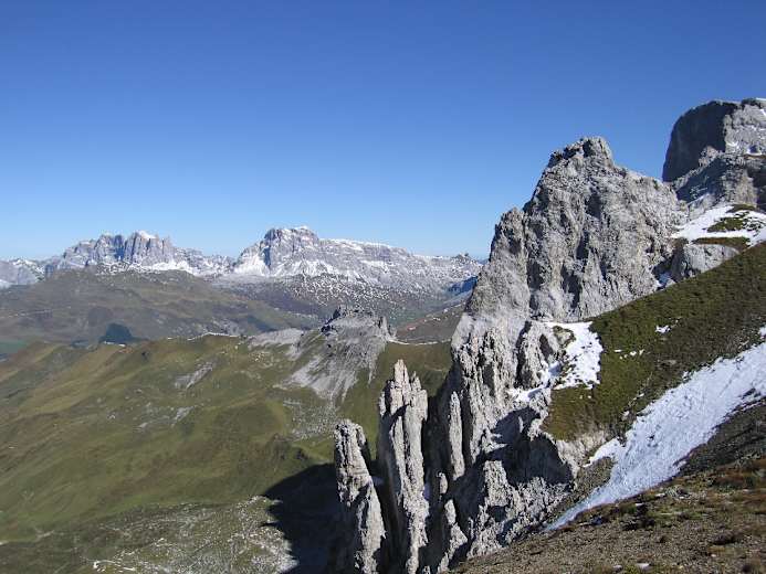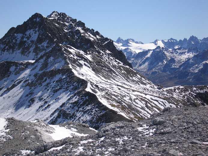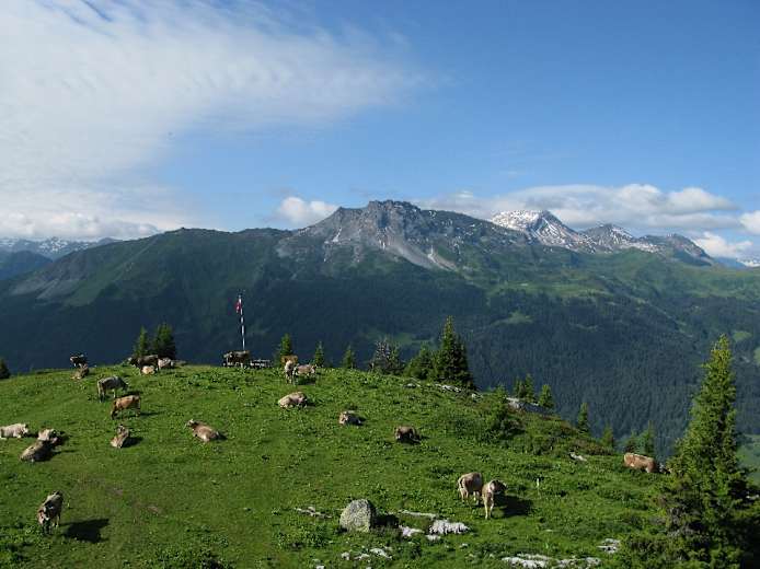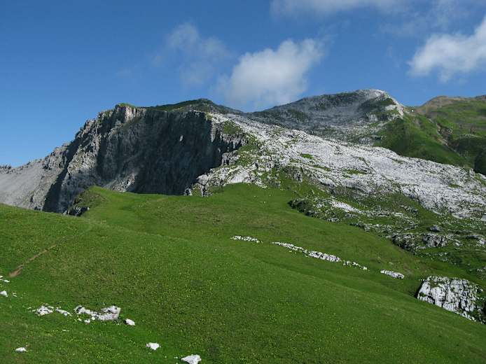 Wir erreichen nun eine Hochfläche unterhalb auffallender „Hörner“ (Geißhorn, Bockhorn). Stets Richtung Nord und dem Gratrücken entlang oder auf diesem Rücken selbst zu einer behäbigen Kuppe, die aber nach West ganz und gar nicht behäbig ist, sondern mit senkrechten Wänden abbricht: der Saaser Calanda.