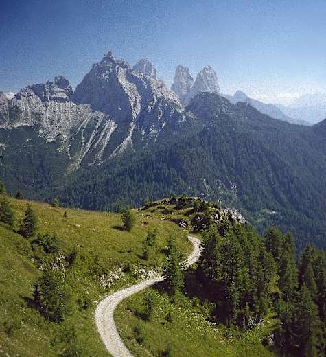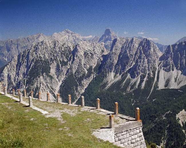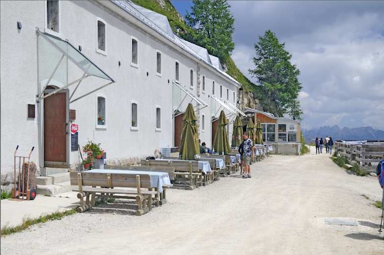 Am Rücken weiter zum Gipfel des M. Rite, 2.183 m, mit umfassendem Panorama über Ostdolomiten und Südliche Karnische Alpen. Zurück zum Museum und dort die Kriegsstraße in zwei Kehren nach links (Süden) hinab zum Rif. Dolomites, 2.160 m.
