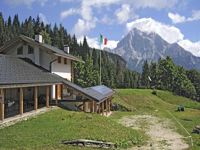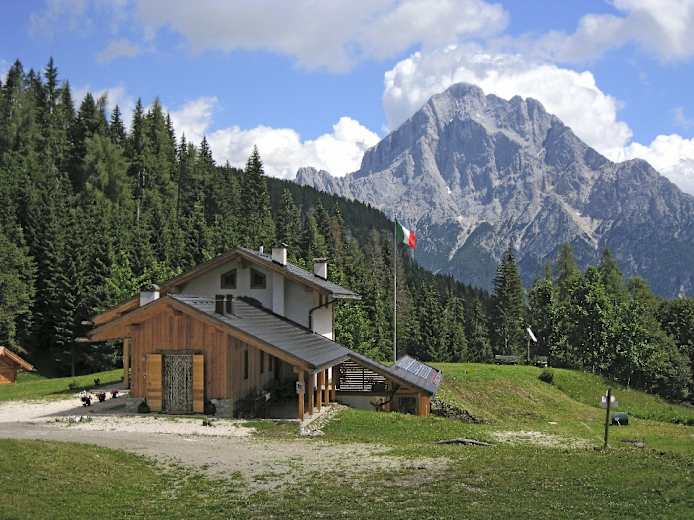 Die Straße mit Weg Nr. 456 geradeaus nahezu eben zu den Heuhütten der Tabià di Fies, 1.583 m. Auf Naturstraße an den Waldhängen ostwärts weiter, später rechts um den Col Botèi herum in die Forc. del Col Botèi, 1.575 m, wo die Straße den Waldrücken nach Nordosten (gegen Valle d’Oglio) verlässt. Rechts ab zu dem auf idyllischer Waldblöße stehenden Rif. Talamini, 1.582 m (Antelaoblick).