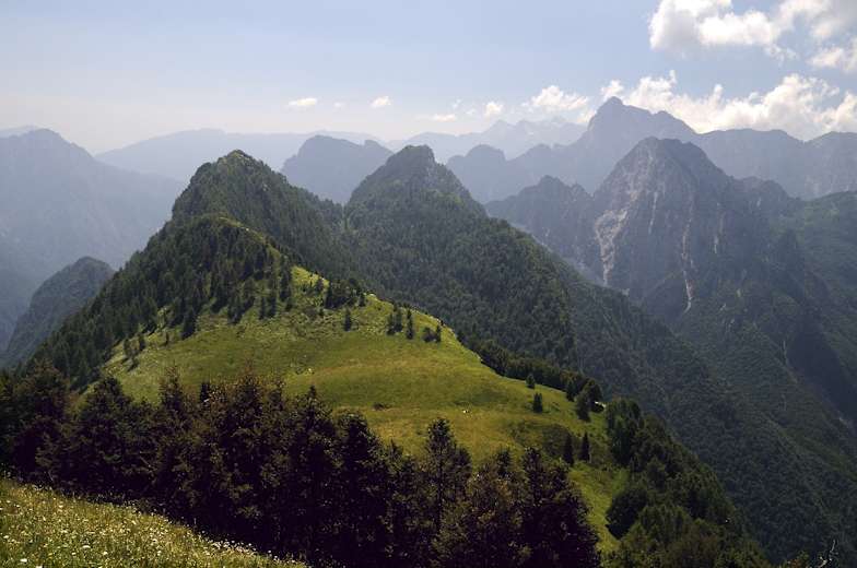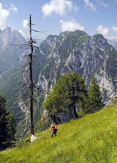 Am schmalen Graskamm weiter, später in seiner rechten Flanke an begrünten Hängen hinab zur Forc. Gallina, 1.875 m. Vorerst noch am Höhenrücken, dann nach rechts in die steile latschenbewachsene Südseite und dort hinab in die Mulde unterhalb der Forc. della Lastra, 1825 m (Wegteilung). Die Mulde wird gequert und eine weitere Verzweigung erreicht. Rechts abbiegen (!) und auf Weg Nr. 930 im felsig-schrofigem Gelände nach Osten bergab, später in langer Querung begrünter Hänge hinunter in das Hochtal Venàl di Montanès, 1.600 m.