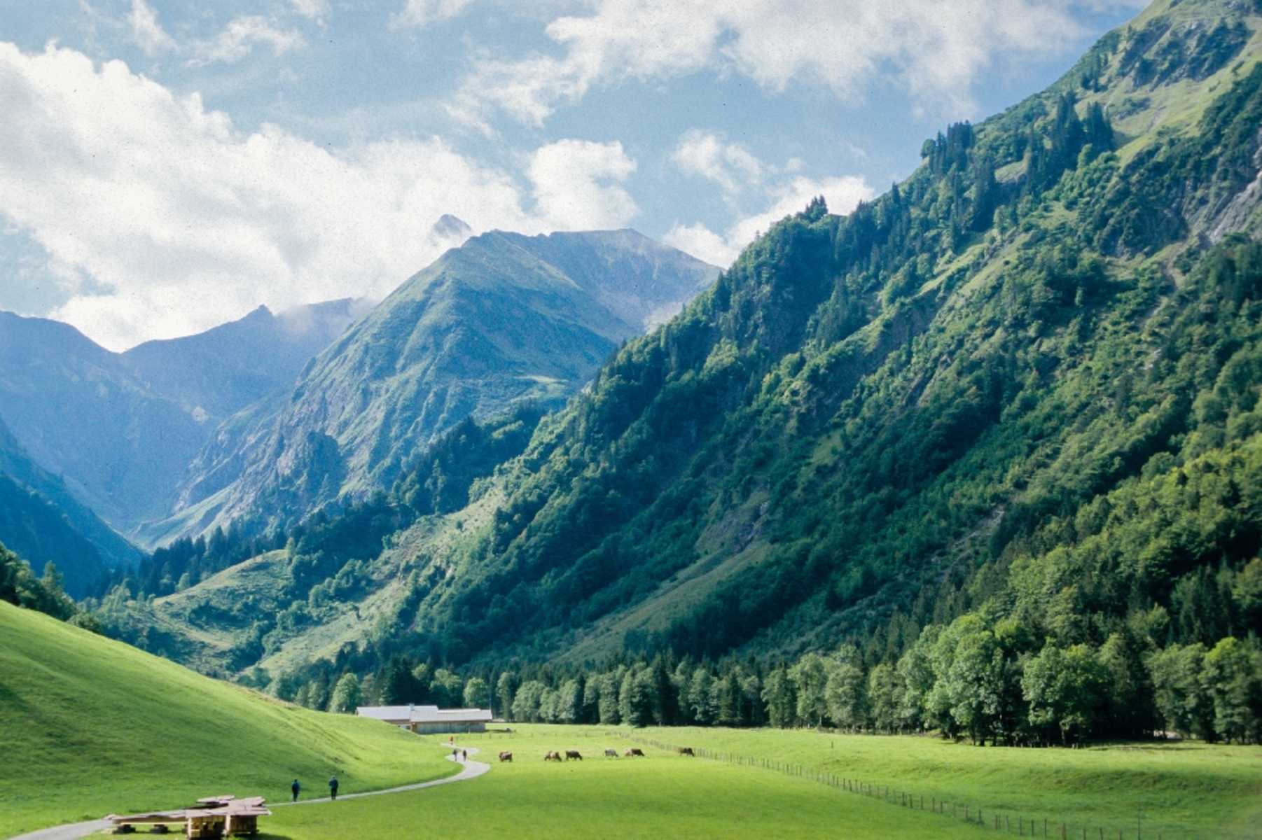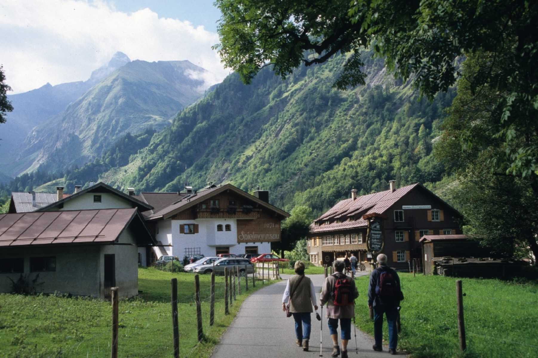 Am See gibt es ein Café und das Waldhotel am Christlessee. Eine Teerstraße führt direkt bis in die Spielmannsau. Der eigentliche Weg wird nach diesem Abzweig bald zu einem Wanderweg, der erst im Wald bergauf und dann eben weiterführt. Sobald wir die Teerstraße erreichen, sind es nur noch wenige Meter bis in die Spielmannsau, 987 m. Von hier bietet sich ein sehr schöner Blick ins Trettachtal, auf den Gipfel der Trettach, 2.595 m, und links auf den Kratzer, 2.428 m.
