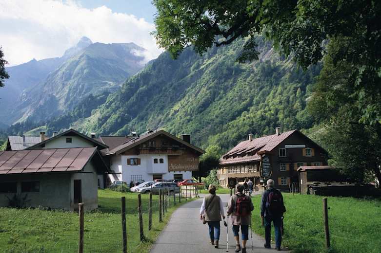 In Oberstdorf trennen uns vom Aufstieg ins Gebirge noch 10 km Ebene bis Spielmannsau, die natürlich zu Fuß, aber auch per Taxi, Bus oder Pferdekutsche überwunden werden können. Glücklicherweise ist das Ziel dabei nie aus den Augen zu verlieren: Der Allgäuer Hauptkamm liegt mit Trettach und Mädelegabel direkt im Blickfeld und lässt die Vorfreude Meter für Meter steigen.