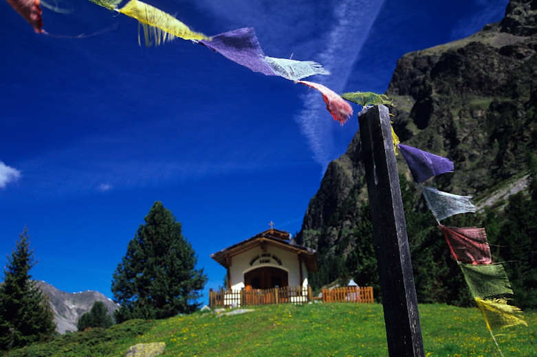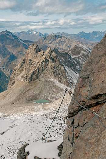 Wir können die Steilstufe umgehen, indem wir wenige Kehren in der Geröllrinne aufsteigen, dann nach links an den Fels queren und dort dem Stahlseil folgen. Einige Stifte wurden hier als Tritthilfe lose in die Wand gesetzt. Am vorläufigen Ende der Stahlseilversicherung queren wir nach rechts in die Rinne hinüber und steigen in wenigen Kehren nach links zurück an den Fels, wo uns eine Kette den weiteren Aufstieg erleichtert. Das letzte Stück hinauf zum Aperen Madatschjoch, 3.030 m, steigen wir wieder in Kehren auf.