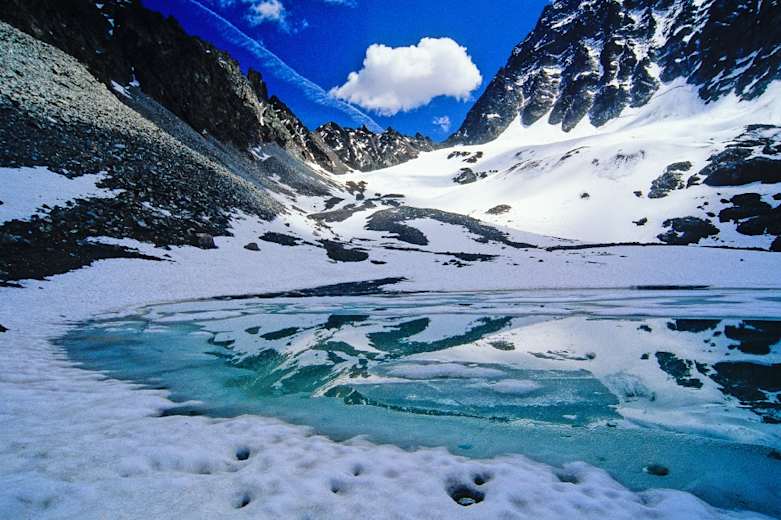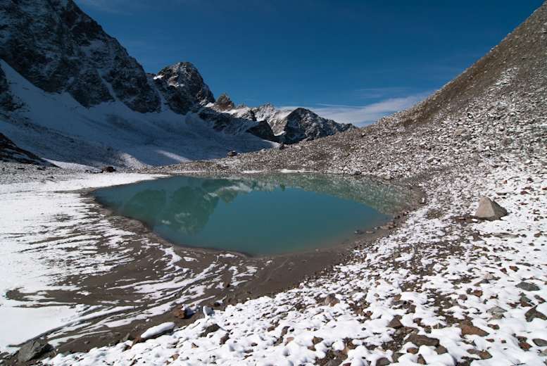 Bald darauf erreichen wir hinter einem Sattel einen kleinen Schmelzwassersee, 2.653 m, in einer Senke. Von dort aus steigen wir auf der linken, also nördlichen Talseite über Blockwerk aufwärts (OSO) und halten dabei direkt auf das Madatschjoch zu. Hier sollte man früh im Jahr, wenn noch viel Schnee liegt, wegen möglicher Schneebretter aufpassen, die von der linken Talseite abgehen könnten. Den Madatschferner müssen wir nicht betreten, sondern lassen ihn rechts im Tal liegen. Je näher wir dem Talende kommen, desto weiter schwenkt der markierte Steig nach links zum Fuße einer breiten Geröllrinne hin, an deren oberem Ende das Apere Madatschjoch auf uns wartet.