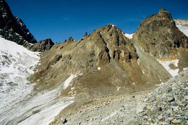 Von der Terrasse der Verpeilhütte aus können wir Richtung Süden schon den Wegverlauf ausmachen: Links sehen wir den Schwabenkopf, 3.378 m, und rechts den Madatschkopf, 2.783 m. Unser Weg wird dazwischen hindurchführen. Zunächst gehen wir also auf Weg 19, 20 und 22 über die Wiese in Richtung Madatschtürme (gezackter Grat, S) und überqueren den Bach.