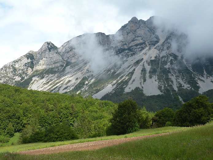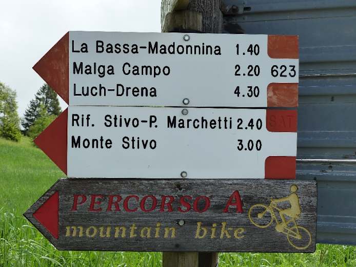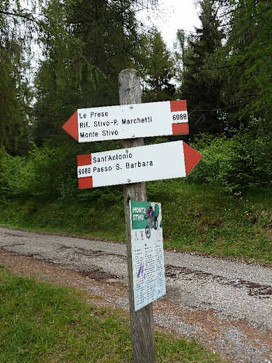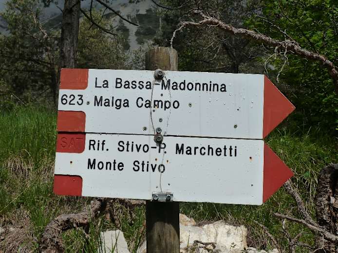 Die weiterhin geteerte Straße steigt nun allmählich an und windet sich durch Wald höher zu einer Geländestufe oberhalb. Hier öffnet sich allmählich die Landschaft und der Blick wird freier. Nach etwa einer halben Stunde Gehzeit (der Weg ist immer gut ausgeschildert: „M. Stivo“, „Rif. P. Marchetti“) endet die befestigte Privatstraße und mündet in einen steinigen Wirtschaftsweg, der bald darauf von einer Schranke versperrt wird. Nun steil durch Wald und über die Almwiesen le Prese weiter durch die Südflanke des Berges.