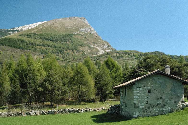 Ein Zaun schützt hier frei laufendes Weidevieh vor einem Absturz. Nun rechts dem markierten Steig (Mark.-Nr. 623, „Acqua delle Fontanelle“) folgend über zahlreiche Kehren steil hinab, dann durch ein Buchenwäldchen zum Punkt Acqua delle Fontanelle, 1268 m, wo wir auf einen Fahrweg treffen. Diesem folgen wir nun eine gute Viertelstunde, bis rechts – am Ende einer Lichtung – ein markierter Wanderweg abzweigt. Auf diesem entlang durch Wald zur Pian Gombino, wo wir auf einen Wirtschaftsweg stoßen. Er leitet uns – bei den folgenden Abzweigungen immer rechts haltend (spärliche Markierung) – durch Wald und über freies Gelände zur Kirche San Antonio und weiter zurück zum Ausgangspunkt oberhalb des Passo S. Barbara.