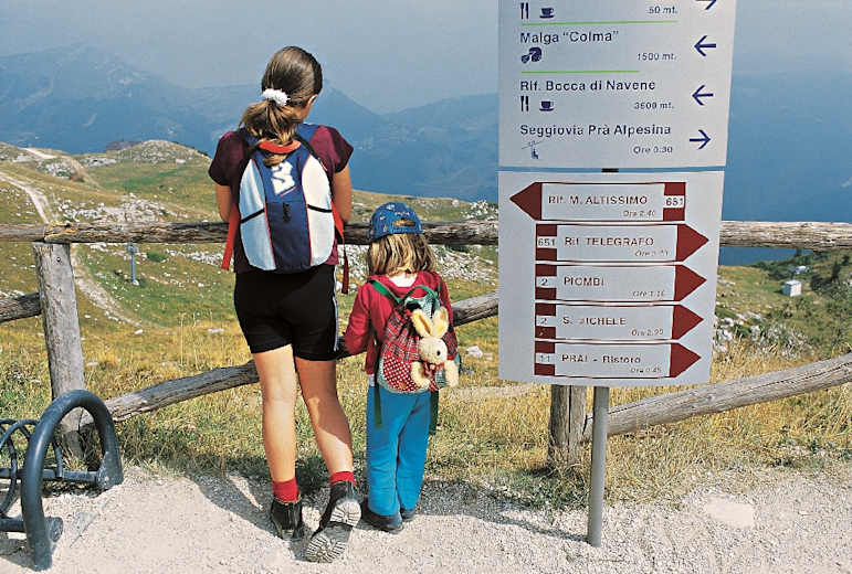Von der Bergstation der Monte-Baldo-Seilbahn, 1.752 m, folgen wir der Kammlinie Richtung Süden (Weg-Nr. 651, rot) zuerst über Bergwiesen hinab zur Bocca Tratto Spino, 1720 m, wo uns zahlreiche Wegweiser Orientierung bieten. Dann geht es weiter über freie Berghänge, die besonders im späten Frühjahr von Blumen übersät sind, auf zunächst leicht ansteigendem Bergsteig auf den breiten Bergkamm zu. Wir erreichen dann den felsigen Grat, passieren zahlreiche Steinmännchen und steigen über felsiges Gelände weiter bergan zu einem Sattel.