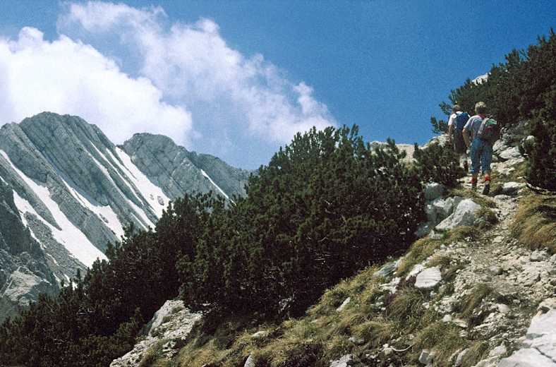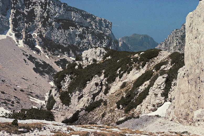 Für den Abstieg wieder die 60 Hm hinab in die Bocca am Gipfelfuß auf der Südseite, dort rechts eben ein paar Minuten weiter, bis wiederum rechts der Steig in das riesige Kar Valdritta (WW „Piombi“, Mark.-Nr. 5, rot) hinabführt. Am Karende müssen wir einen leichten Gegenanstieg zur Baita Valdritta, 1.901 m (herrliche Tiefblicke) in Kauf nehmen, dann wandern wir durch Latschen in Richtung Norden und weiter talwärts, bis uns ein schöner Buchenwald aufnimmt.