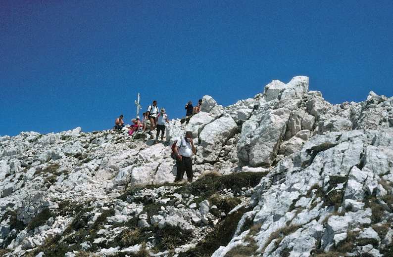 Wir umgehen den Gipfel zuerst nach links und folgen dann dem felsigem Steig (Wegweiser) dann rechts in einer Viertelstunde etwas luftig hinauf auf die Cima di Valdritta, den höchsten Punkt des Monte-Baldo-Kammes (Gipfelkreuz). Der Panoramablick ist überwältigend, im Hochsommer kann er allerdings durch Dunst getrübt sein, den gewaltigen Eindruck kann das jedoch kaum mindern. (Wer den anspruchsvollen Abstieg scheut, kann zur Bergstation zurückkehren – letzte Talfahrt beachten!)