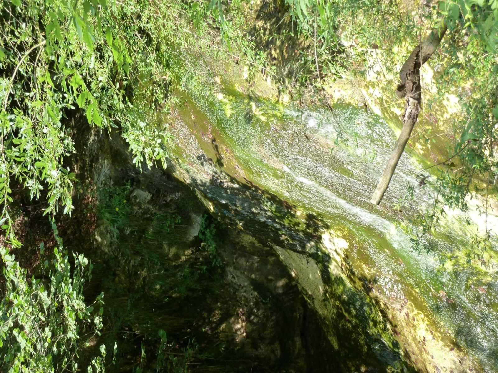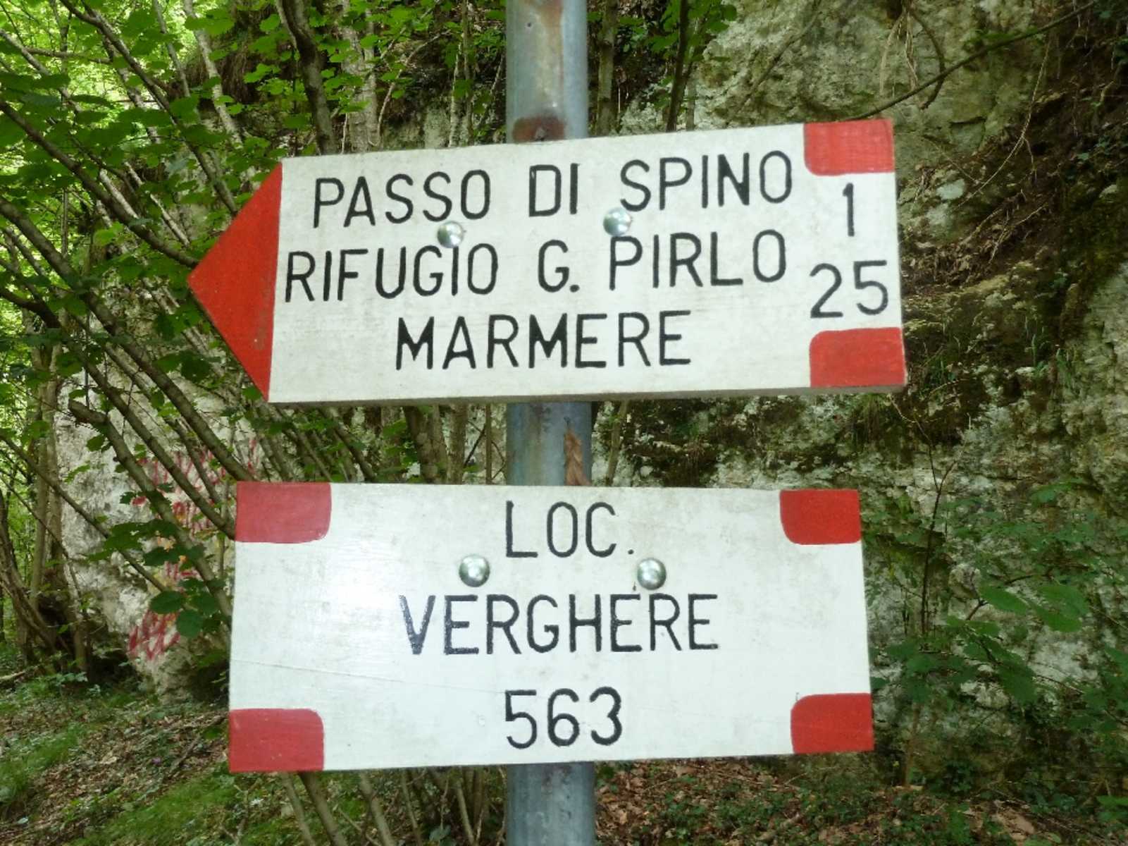 Das Tal wird enger und die Gebäude von Verghere lassen wir hinter uns. Der Fahrweg endet und wird rau. Hier beginnt der ehemalige, nur noch zum Teil vorhandene Maultierweg (Mark.-Nr. 1/25 rot-weiß). Wir wandern immer dem Barbarano-Bach entlang mit seinen reizvollen kleinen Wasserfällen. Nach 20 Minuten vom Ende des Fahrwegs halten wir uns rechts, queren dann zweimal den Bach, steigen zuerst nur mäßig, dann steil bergan. Wir passieren zwei Wasserspeicher und nach weiteren 20 Minuten halten wir uns bei der Weggabelung rechts.