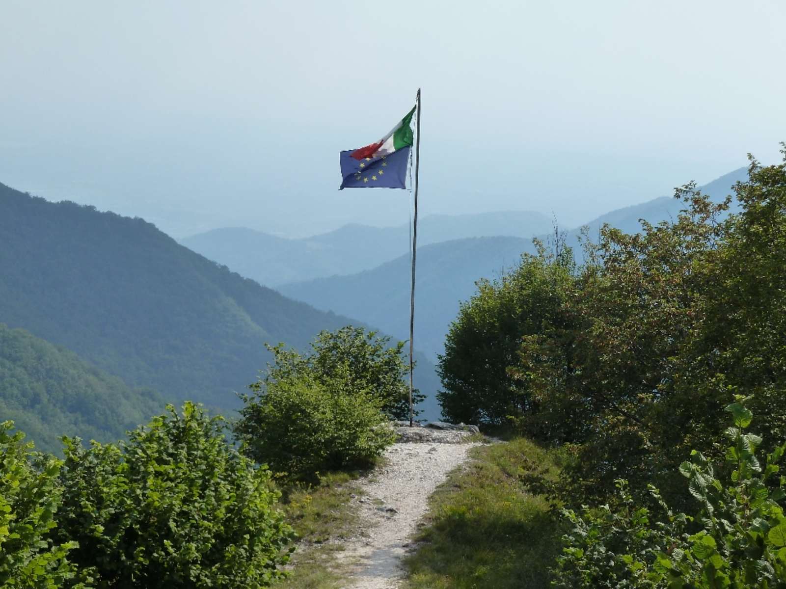 1. Die „Via Ferrata Spigolo della Bandiera“ (Einstieg: 1.050 m) führt nahezu senkrecht durch gut griffigen und gestuften Fels; fest verspannte Stahlseile; die Schlüsselstelle (ein paar Meter überhängender Fels) ist erst kurz vor dem Ausstieg; danach Gehgelände (¾ Std.).