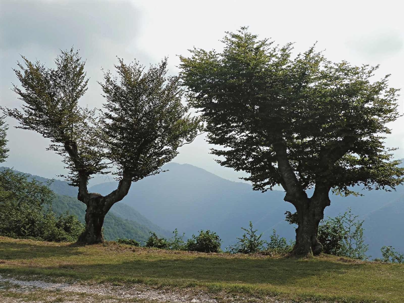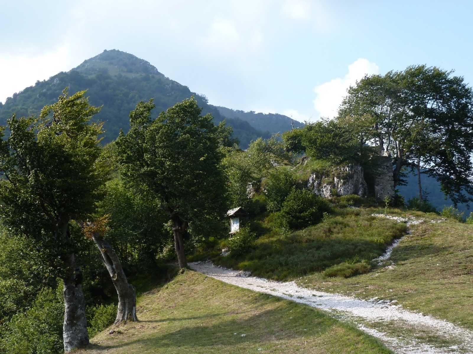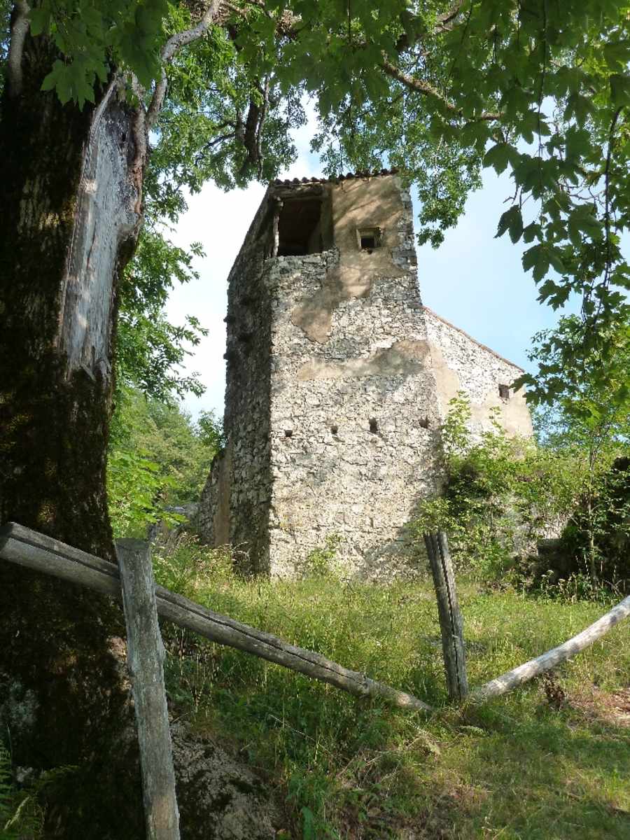 Links haltend wandern wir leicht fallend durch Wald, dann über ein paar weite Serpentinen zum Punkt Gemelle, einer völlig überwachsenen Alm, wo wir wieder auf unseren Anstiegsweg treffen. Auf diesem hinab ins Tal und hinaus nach Colomber, unserem Ausgangspunkt.