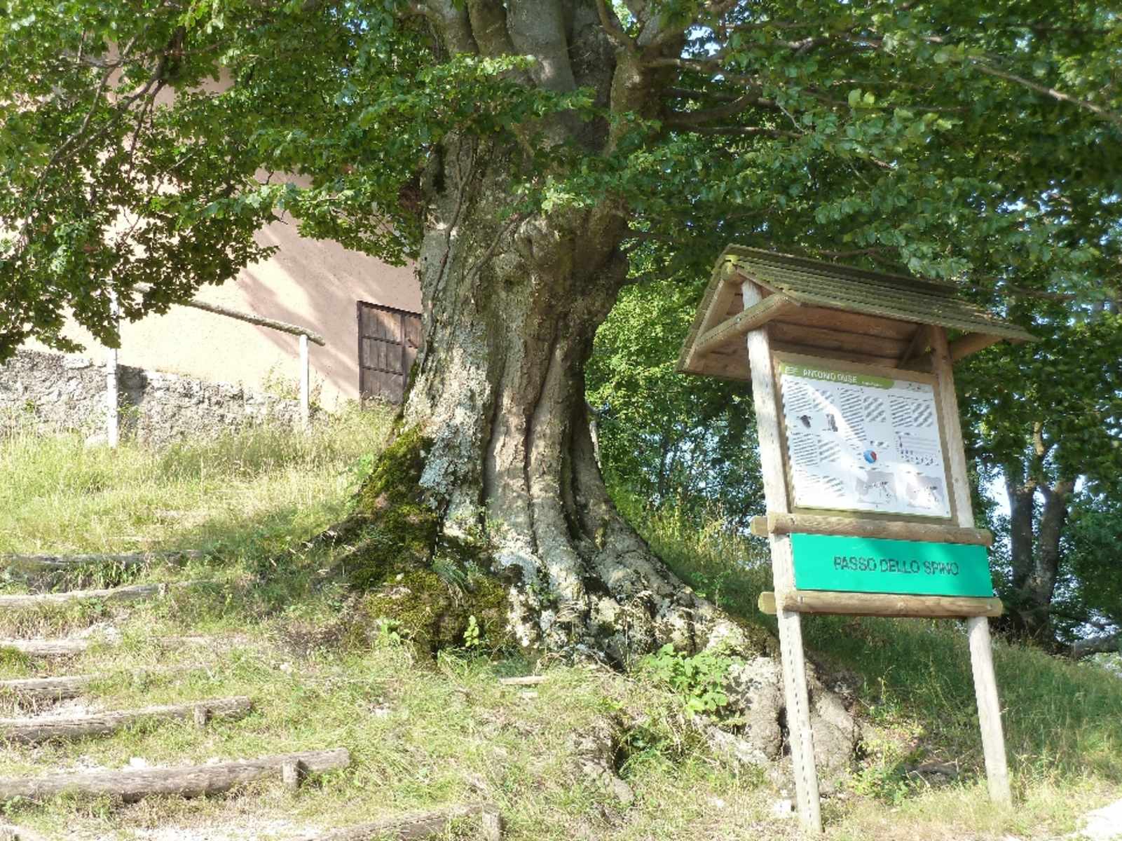 Diese durchsteigen wir aber ohne Probleme leicht links haltend. Ein schmaler Pfad führt uns schließlich hinauf zum Rifugio Pirlo allo Spino. Das auf einem Geländevorsprung stehende Haus bietet uns nach dem langen Aufstieg durch Wald endlich eine herrliche Aussicht über das lange Tal hinweg, das wir durchschritten haben, und rechts auf die zackigen Gipfel des Monte-Spino-Kammes. Links haben wir den Passo di Spino im Blick. Außerdem hat das Rifugio eine überdachte Terrasse, was sehr hilfreich ist, falls wir einmal vor verschlossener Tür stehen sollten.