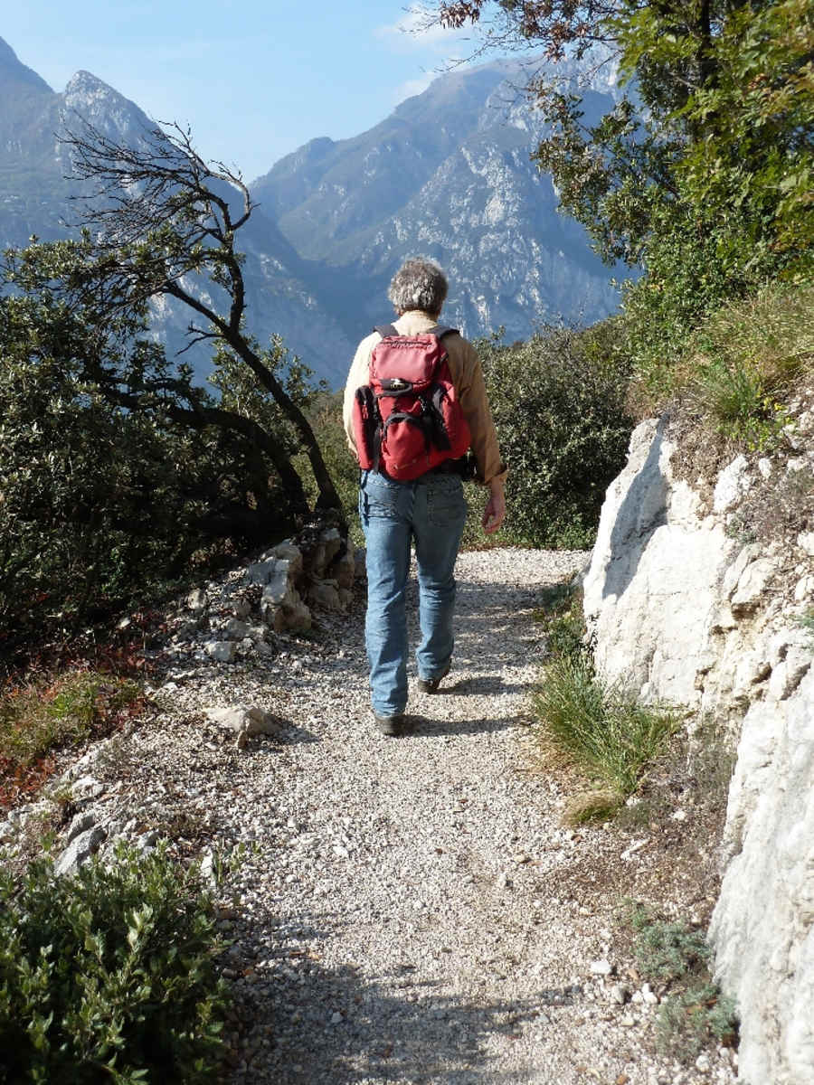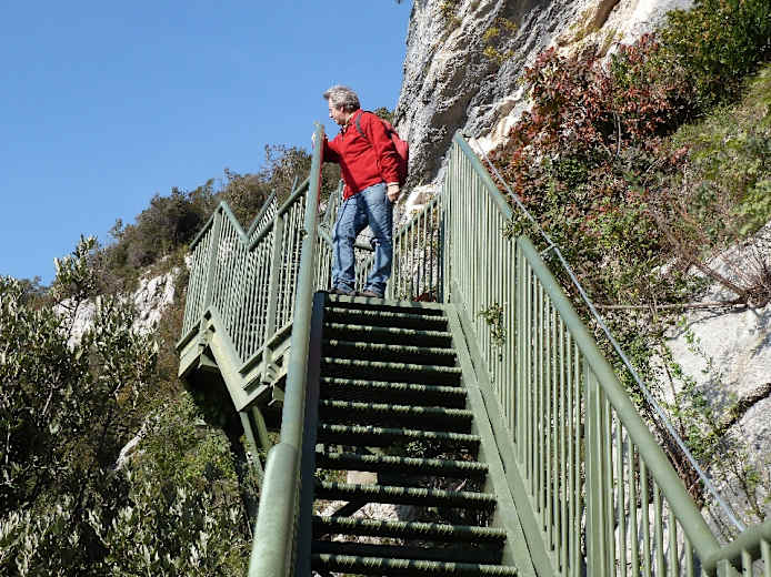 An offenen Stellen, wo Sitzbänke stehen, bieten sich fantastische Tiefblicke auf den Gardasee und die gegenüberliegenden Berge. Später steigen wir einen Felsabbruch über die erste hohe Metalltreppe hinunter. Anschließend bewegen wir uns zunächst auf ebenem Fuß, dann leicht ansteigend weiter durch den dichten Buschwald, der vorwiegend aus immergrünen Steineichen besteht. In Abständen stehen Lehrtafeln am Weg, die uns über die heimische Fauna und Flora informieren.