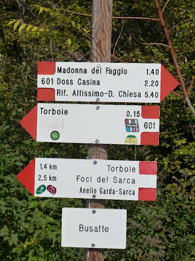 Diesem folgen wir mit der Ausschilderung „Tempesta“ nach rechts und gehen zuerst leicht, dann steiler abwärts. Bei einem Holzlagerplatz mit Brunnentrog nehmen wir nicht den Pfad, der abwärts führt, sondern steigen auf breitem Weg wieder an. Nach einem weiteren einmündenden Forstweg gehen wir noch geradeaus und steigen schließlich in Serpentinen zum Seeufer bei Tempesta ab. Bei einer Schranke und einem kleinen Parkplatz erreichen wir die Gardesana Orientale. Dieser folgen wir rechts 250 m weiter zur Bushaltestelle, wo die Rückkehr nach Torbole möglich ist.