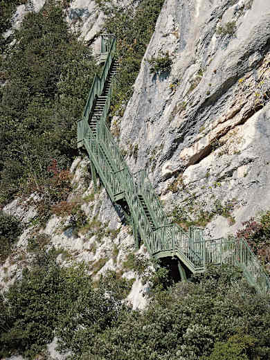 Wir nehmen einen von links kommenden Weg auf, überwinden mit der zweiten Metalltreppe den nächsten großen Felsabsturz. Von der hohen, aber gut gesicherten Treppe genießen wir immer wieder die herrlichen Ausblicke auf den See und die gegenüberliegenden Berge. Die dritte Treppe ist nur kurz, dann erreichen wir ein Waldstück und wandern zunächst eben, dann leicht ansteigend zu einem querführenden Forstweg (hier Rückkehrmöglichkeit).