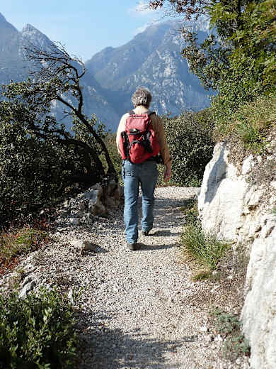 Dort folgen wir links einem breiten Fahrweg, der aufwärts führt und uns im Rechtsbogen in den Hang bringt. Hinter einer Wegerweiterung geht es links weiter bergan bis zu einer nahen Weggabel, wo wir nicht links, sondern geradeaus gehen. Nun wandern wir auf gut angelegtem Weg bequem dahin. Er läuft durch den Steilhang des Monte Baldo, etwa 120 m über dem Gardasee. Meist umgibt uns dichter mediterraner Wald. An lichten Stellen passieren wir Blockmeere oder nackte Felsplatten.