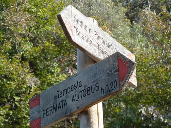 Wer am Ende der Wanderung nicht nach Tempesta absteigen will, kann nach einer ausgiebigen Rast im Waldstück nach der letzten langen Treppe bis zur Wirtschaftsstraße weiterwandern, dort dann links (bergwärts) diesem folgen, bis man nach einer längeren Schleife wieder auf den „Sentiero“ trifft, und zwar bei der Weggabel, bei der wir auf dem Hinweg achtsam sein müssen, um auf dem Panoramaweg zu bleiben. Dort folgen wir dem Hinweg zurück bis zum Sportpark Busatte.