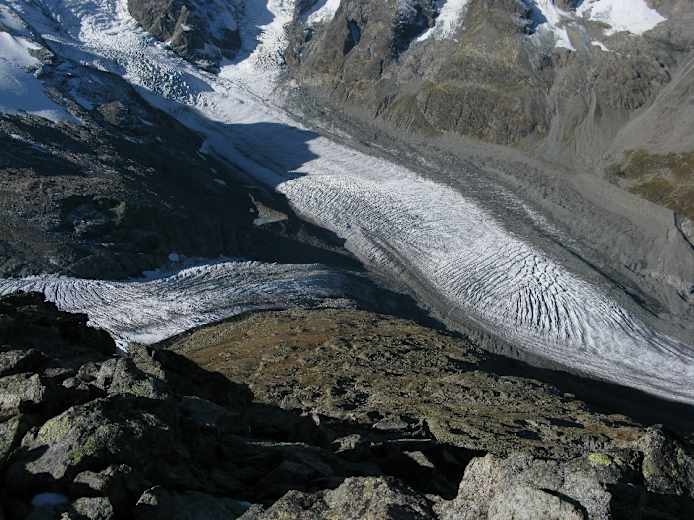 Abstieg zur Station Morteratsch. Bereits bei einer Weggabelung in einer Höhe von 2.355 m hält man sich links. Über die Flanke, in einer langen Hangquerung, geht es nach Morteratsch. 1 Stunde länger.