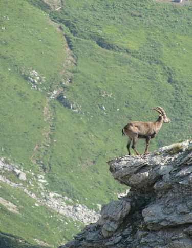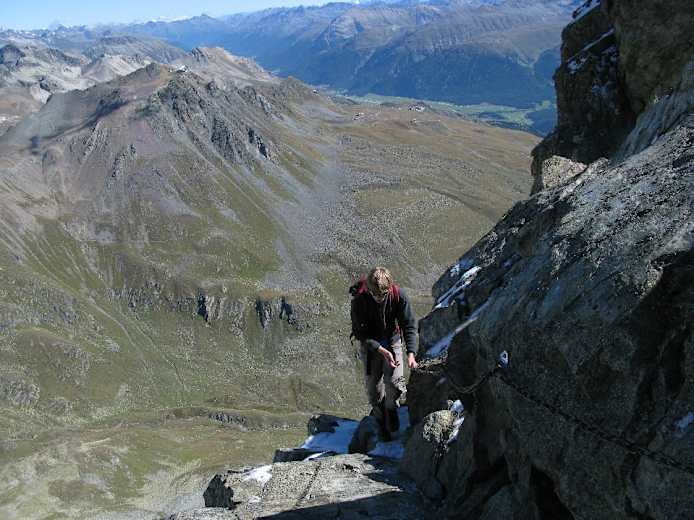 Nun beginnt der gesicherte Steig. Über einen Südrücken zum Ostgrat. Über den Grat, etwas auf und ab, teilweise in der Südflanke, einmal in die Nordflanke ausweichend (Kette), zuletzt über den Ostrücken steil, aber weniger schwierig zum Gipfel. An heikleren Stellen nehmen stabile Eisengeländer, Sicherungsseile oder Ketten etwa aufkommende Tiefenängste.