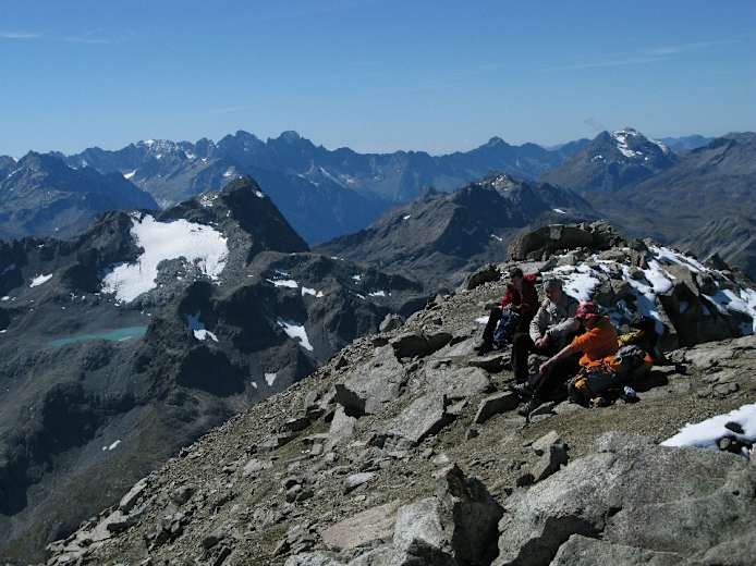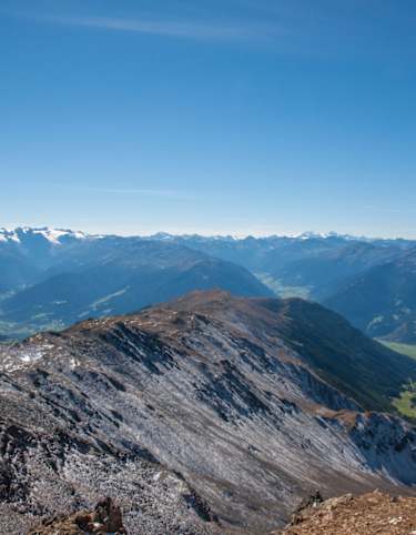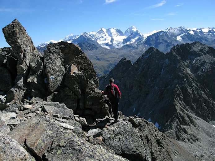Der beherrschende Gipfel bietet eine entsprechend umfassende Aussicht in die Bernina-Alpen, das Bergell und die Albula-Alpen.