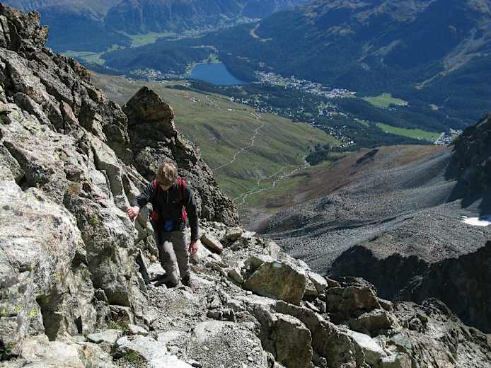 Anspruchsvoller Aufstieg zu einem beherrschenden Gipfel des Engadin: Der Piz Julier (3.380 m) in der Berninagruppe ist als mächtiger Felsklotz auch von weit entfernten Gipfeln gut zu sehen. Er gilt neben dem See und dem „Schiefen Turm“ gewissermaßen als das Wahrzeichen von St. Moritz im schweizerischen Graubünden.