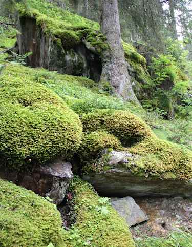 Oder: Kurz nach dem Start nach rechts und auf einem Fußweg durchs Rosegtal nach Pontresina. Selbst hier kann man noch Wild (Gämsen, Rotwild) beobachten. Man erreicht Pontresina nahe dem Bahnhof.