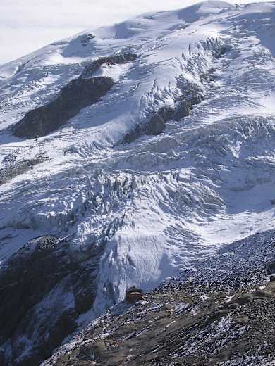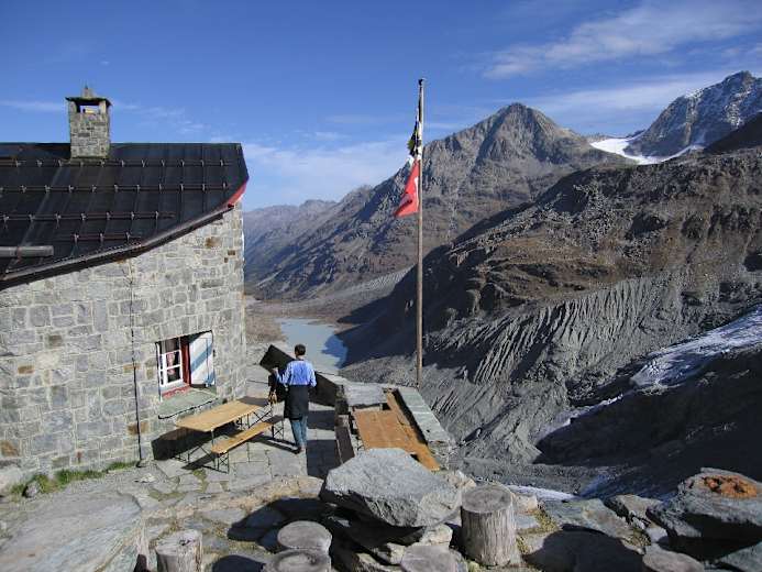Chamanna Coaz, 2.610 m. Von der Abzweigung in einer leicht fallenden Querung. Hin und zurück 45 Minuten. Beeindruckende Lage auf einer Kuppe über dem Roseggletscher. Lohnend!