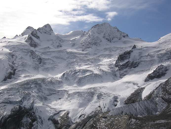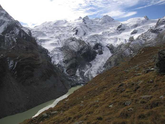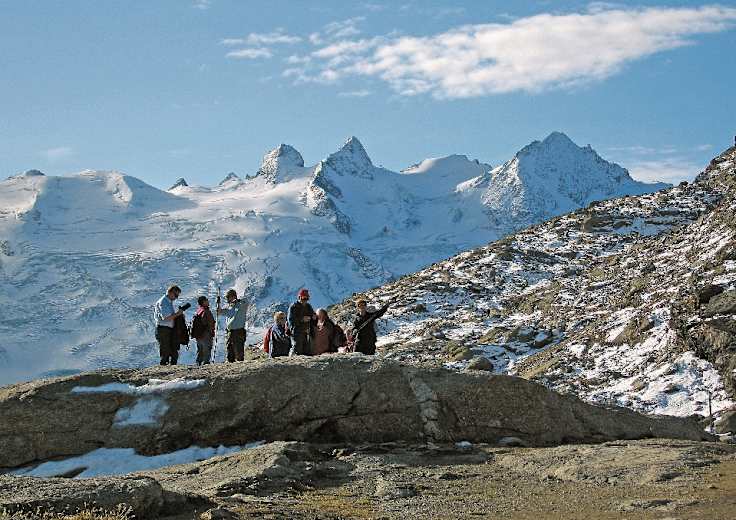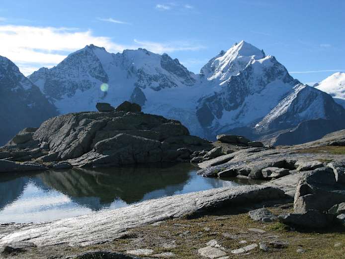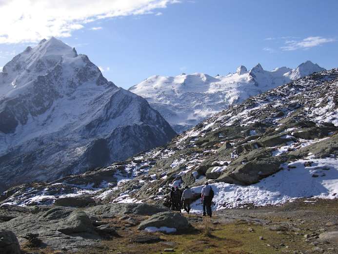 Von der Mittelstation Murtèl der Corvatschbahn wandern wir auf überbreitem Weg kurz abwärts, gehen die weite Mulde aus und erreichen nach einigen Kehren die Fuorcla Surlej (2.755 m). Hier öffnet sich der Blick zu den gewaltigen Gipfeln der Bernina-Alpen! Vom Berghaus Fuorcla Surlej (kurz danach Abzweigung direkt zum Hotel Roseg, einer kurzen Variante) wandert man zunächst südwärts auf den Roseggletscher zu.