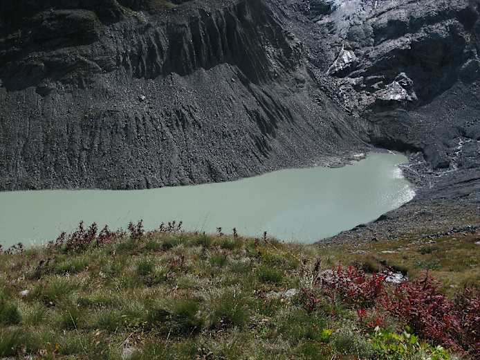 Bei der Abzweigung zum Gletschersee (Hinweisschild) geht es geradeaus zur Coazhütte weiter. Wir halten uns links und steigen den langen Hang zuerst nach links querend, dann steil zum Lej da Vadret ab. Am See entlang zu seinem Nordufer und mit geringem Gefälle zum Hotel Roseg. Von hier auf dem Fahrweg (bequemer mit der Pferdekutsche) nach Pontresina.