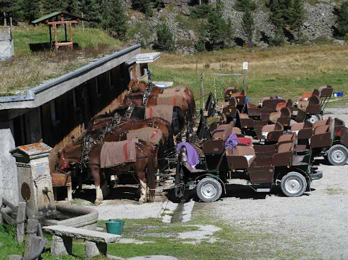 Vom Gletschersee kann man sich auch – bequemer, aber teurer – mit der Pferdekutsche durchs Rosegtal nach Pontresina kutschieren lassen (Anmeldung nötig, Auskünfte beim Kur- und Verkehrsverein Pontresina).